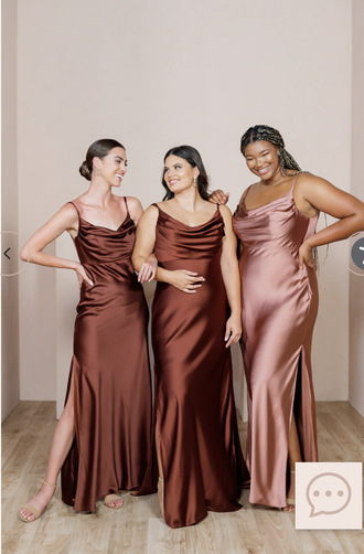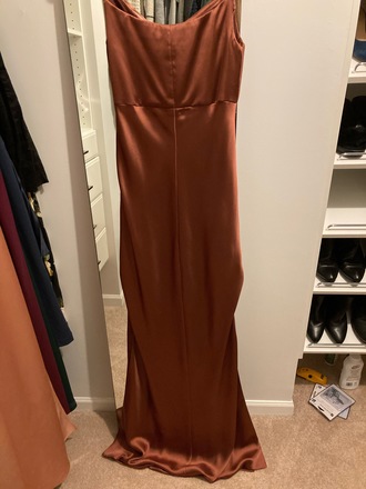 Revelry Skye Satin Dress in Terracotta Rust - 709 (middle model). Retails for $189. Fits like a size 4 in my opinion. See website for sizing.