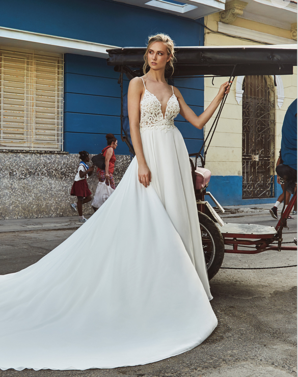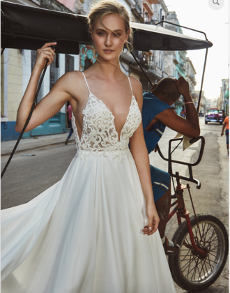 BRAND NEW GOWN - never altered & never worn! Calla Blanche L'Amour Drew Gown (LA8237) Ivory/Light Nude This is a whimsical A-line gown with sparkly beaded deep V bodice and low back that is very flattering for any body type. It has a lovely, flowing chiffon cathedral train that adds a dramatic bridal look while still being very light weight and comfortable. Would be a great gown for both an indoor or outdoor venue. I love this dress, but ultimately decided on a different gown for my day due to changes because of COVID-19. I am 5'11" and would have needed to get this dressed hemmed to fit my 2.5" heels I planned to wear with it, so there is plenty of length for tall brides to work with! In pristine condition with tags still on - never worn and never altered. https://www.callablanche.com/product-page/la8237-drew