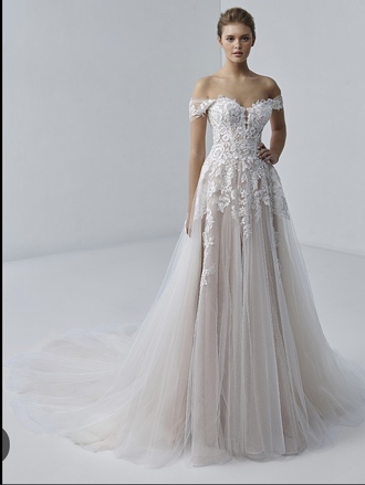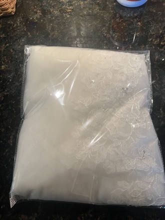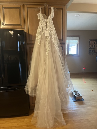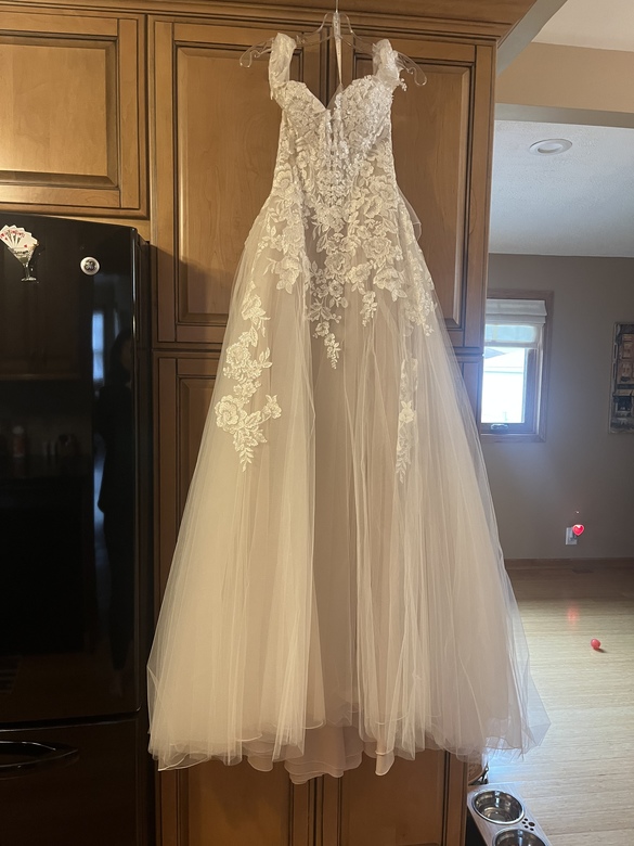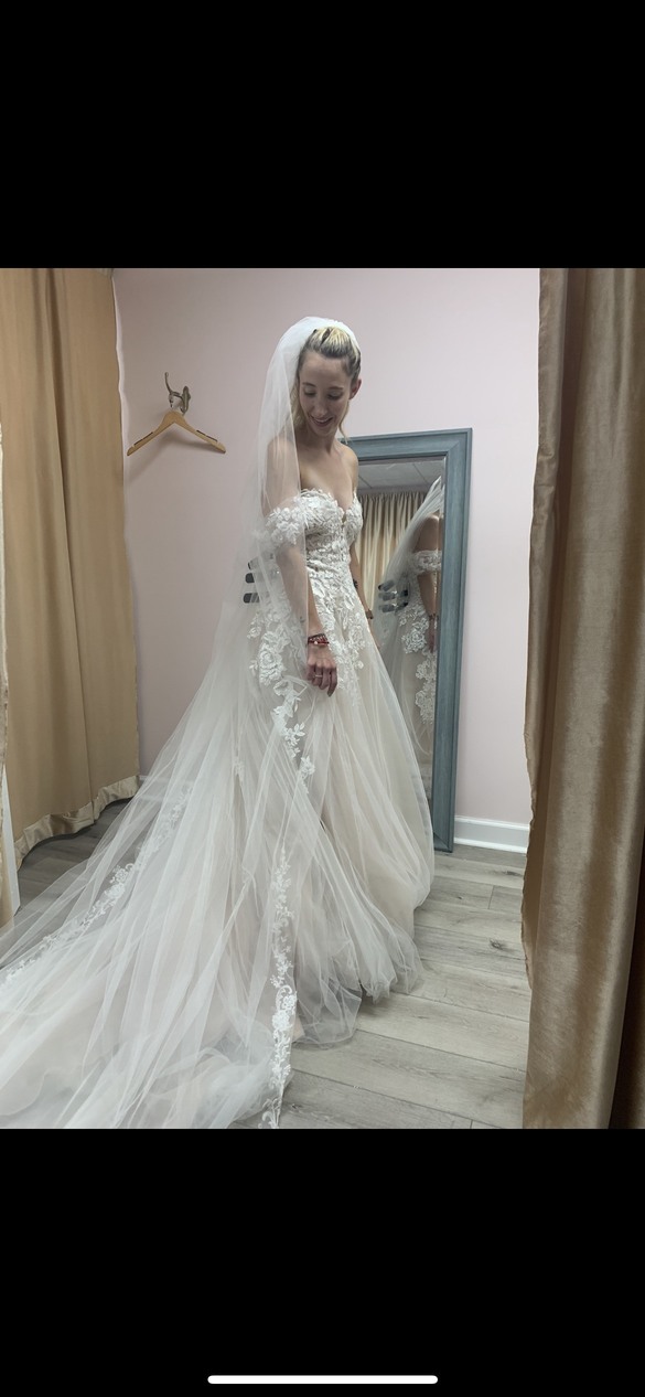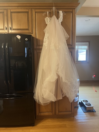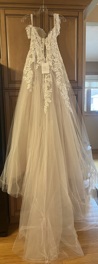 This dress has never been worn or even tried on. The dress was picked up from the boutique and has been sitting in the packaging it came in. There is a vail that was bought with the dress that is shown in one of the pictures tried on that is included in the price.