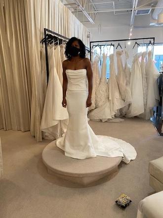 Dress originally $5,600 The dress is originally a size 6 however I am a size zero in reality so the dress was altered to fit my frame. It was also hemmed. I am not sure how much was removed but I am 5'1" tall and the length was perfect with heels. I also had the designer add small covered buttons on the entire train. The dress is low-cut and fits very sultry (smug). I fell in love with the dress because of its clean lines and provocative fit. I am not into poofy dresses. The dress will be well suited for a very petite bride. From the Designer: Ines Di Santo Finch wedding dress is made with silk crepe and French lace. The dress is strapless with a modified detail mermaid cut. The back has a cut out with mesh for support.