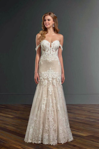 https://www.essensedesigns.com/martina-liana/wedding-dresses/1012/ Martina Liana Style #1020 Ivory Lace and Tulle over Honey Gown with Porcelain Tulle Illusion A one-of-a-kind style, this wedding dress with handcrafted lace from Martina Liana is a head-turning design. The sheer bodice of this gown is adorned with bold lace that is hand-placed to elongate the body. From the sweetheart neckline, drapey lace falls into dreamy off-the-shoulder straps. The lace from the bodice extends slightly onto the hips, creating a negative space at the front of the gown, allowing the lace to truly stand out. Just below the hips, the lace and tulle skirt extends to the ground, finished with an organic hem and subtle sparkle throughout. The backside of the bodice is also sheer and highlights the gown’s boning. Ruching accentuates the back of the bodice, and a dramatic, soft train completes the look. The back of this handcrafted lace wedding dress zips up beneath crystal buttons. Color: Ivory Lace and Tulle over Honey Gown with Porcelain Tulle Illusion Size: Purchased Size 6 Martina Liana Size 6: 33 in bust 25 inch waist, 36.5 hip, Alterations: hips taken-in 34.5, length hemmed My height: 5’2 1/2”, wore platform heels: 1in platform, heel height 4 3/4 in Other alterations: Straps. dress was more flattering on me when we altered the “drop sleeve” lace straps to lay as regular straps. Straps can be altered to original drop design