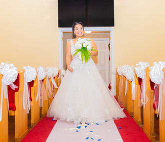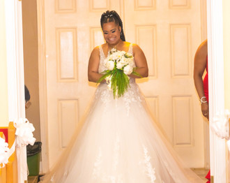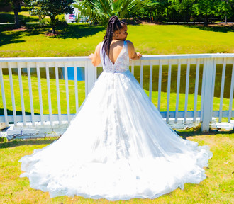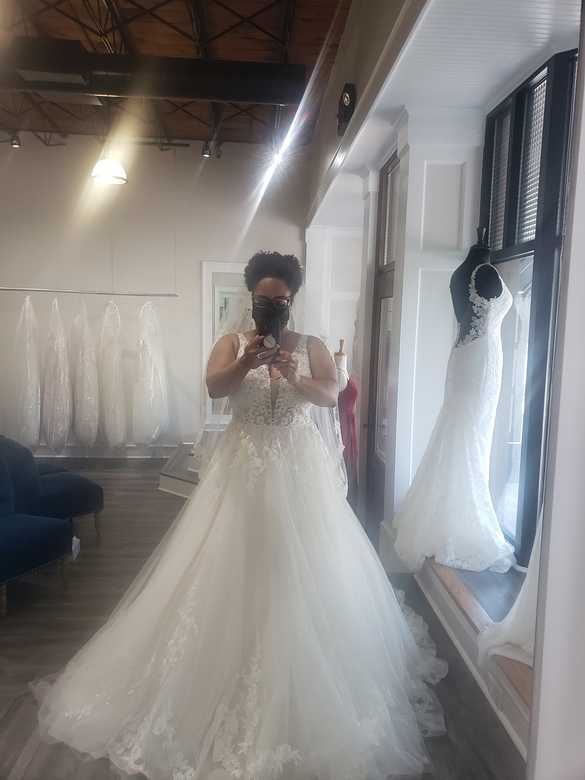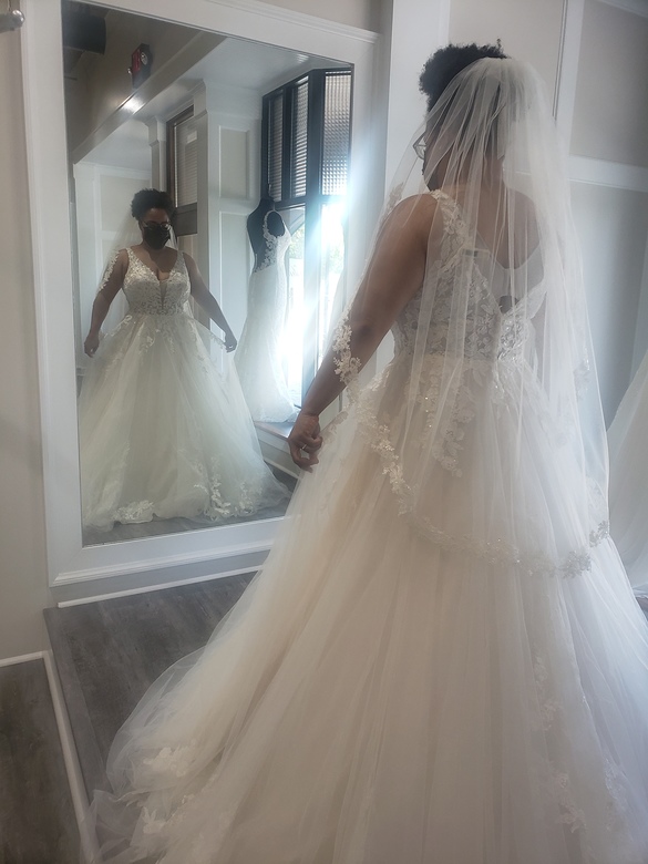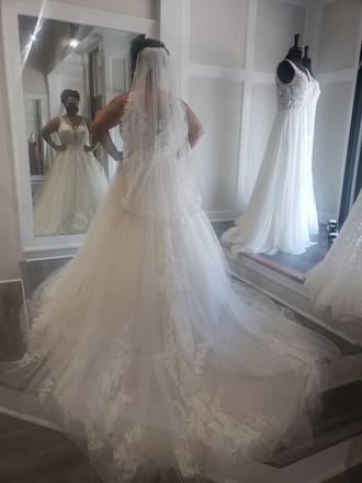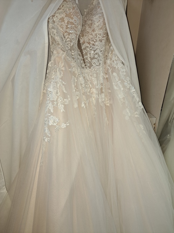 Dress is gently used. My wedding was on April 22. I wore it for a few hours and changed into another dress. I had the front of the dress slightly shortened by a seamstress. It was shortened very little and only in the front. Did not shorten the long luxe train of the gown.