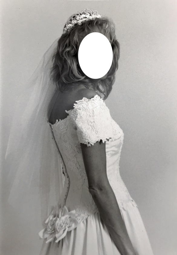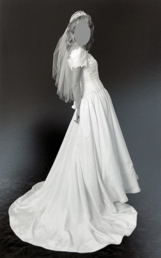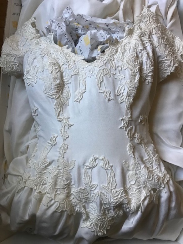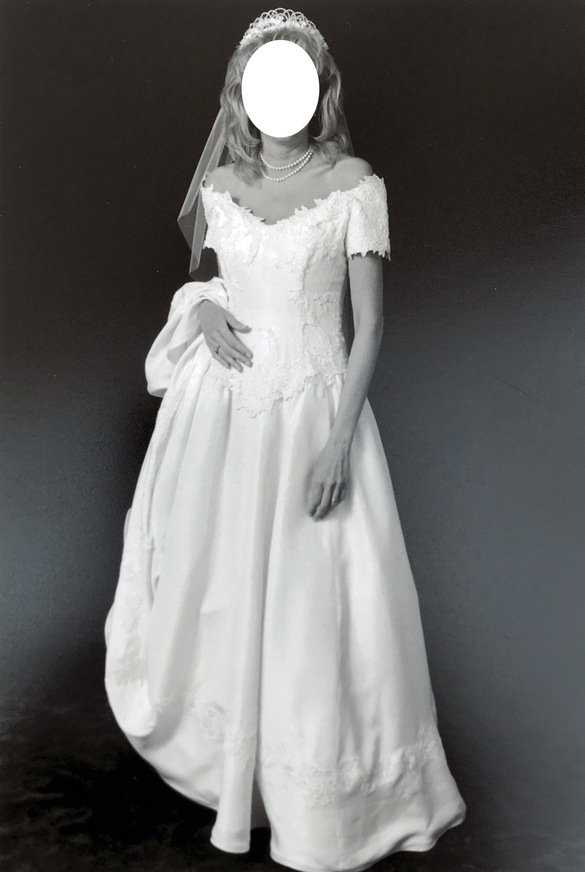 Designer unknown because this was a sample. Absolutely clean and no imperfections. Best feature of the dress is the fabric -- a raw silk that is soft (not slippery or shiny). It is neither bright white nor the usual off-white. Raw silk has a distinctive color that I'd describe like a pale cream. "Cupholder" sleeves can be removed for a totally strapless look; they are not functional to holding up the dress. Can provide crinoline with sale if interested.