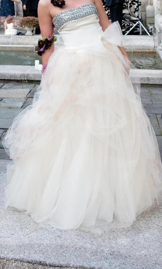 color family Shades of ivory Color Ivory/champagne label size 8 street size6 Vera Vang iconic look,Strapless soft beligown with vintage cristal beadwork at bust. Natural waist, watercolor and drapet skirt. Elegance achieved with its silhouette,classic touch with vintage beads,hip and different with asimmetry in the draping and watercolor flowers, fun factor with funky bow at waist