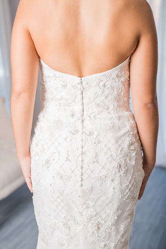 For brides who have a huge inclination and love for hand-beaded lace details, the Pascale gown is an ideal choice. Featuring a sexy low V-back, covered with delicate buttons sweetly trailing from the bodice to the hem of the train, the Pascale wedding gown will offer brides a chance to flaunt their well-toned back in the best way possible!