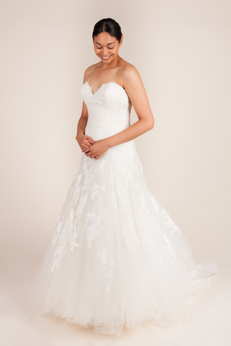 Decked out with all-over lace with the softest tulle skirt on a classic mermaid silhouette, Pebbles is sure to capture all your guests’ attention without you putting much effort! Lattice geometric patterns of the lace elongate the figure while adding decorative details guaranteed to take breaths away.