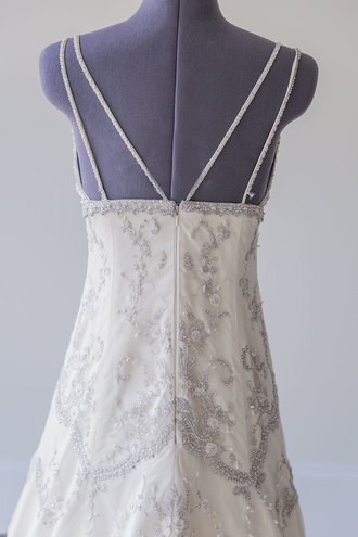 His collection Tara Keely bridal is inspired by feminine silhouettes and soft alluring fabrics, blended with an eye-catching mix of detailed laces, lush tulles, and accents of shimmering sparkle. Offering brides the ideal romantic vision, this collection is ideal for the bride who embodies an effortless beauty, grace, elegance, and timeless sophistication. The wedding gown Sofia from Lazaro Tara Keely is a sheath wedding dress adorned with sparkled embroidery, with tulle and plunging 'V' neckline and has spaghetti straps. The gown features a perfect blend of criss-cross, floral and swirls sparkling pattern all over the gown, a low 'V' back that flares out to a rounded train is the chapel length.