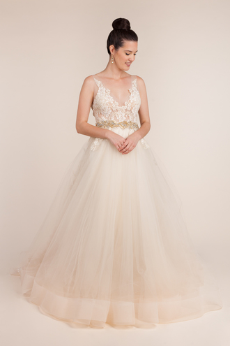 Lazaro’s Olivia is an ivory petal embroidered tulle over sparkle net and Chantilly lace two-piece bridal gown, strapless sweetheart neckline. The gown features an off the shoulder sheer cap sleeve, natural waist, trumpet skirt with horsehair trim at the hemline. A detachable shimmer tulle skirt with cascading petal applique, chapel train, and matching veil complete the look. The Sunday Rose from one of the collections by Lazaro is a stunning ball gown featuring a sweetheart neckline with a tulle skirt and a court train. The gown is strapless and is adorned with a gorgeous embellished belt.