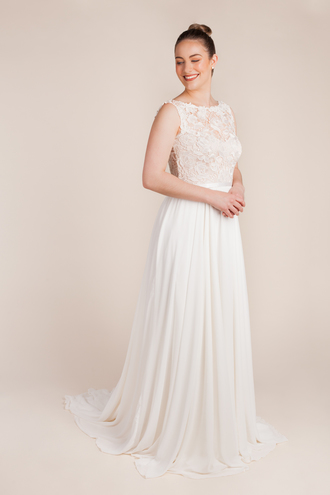 The Wilder wedding dress by designer Sara Joseph gracefully brings a fashion-forward approach to every bride’s wedding day! An ideal choice of wedding dress for contemporary, wild, and fun brides! The Wilder wedding gown is designed with three different laces layered and creatively blended. The detachable sleeves and the most gorgeous flirty train of the Wilder wedding dress will add an extra flair of grace and drama to the overall bridal look of a bride!