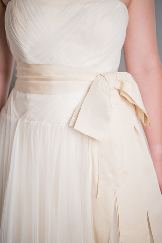 Last but not least is the "Gardenia" hand-draped French tulle and silk organza halter gown with cut-out detail. Framed in light ivory for its best effect, the dress can be accented by light ivory hand-cut silk organza flowers and pale pink hand-rolled silk Duchesse satin flowers, that match ideally well with sage and smoke organza flowers. And for the pictures to turn out awesome, your stylist can give final makeup touches to your smokey eyes along with a neat hairdo.