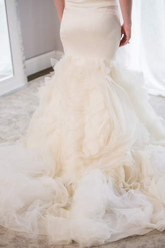 "Tulip" styled gathered French tulle gown with a draped sweep is an amazing piece of beauty to get fit in for your special wedding party. While you can see the center front slit at the bodice and skirt, the arm tie accents, plunging V-back, and exposed corset is just a complete package for your wedding dreams to take wings. For an X-factor, silk organza flowers can be added in the sleeves and your wedding pictures turn out to be truly spectacular.