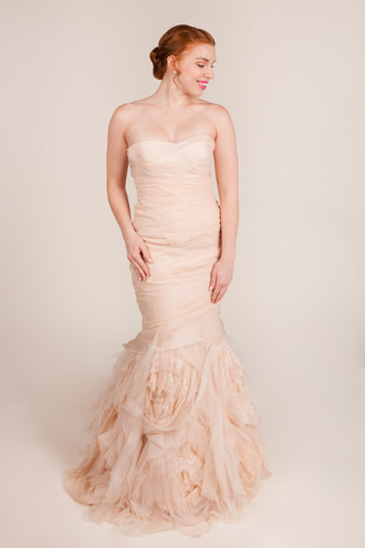 Vera Wang’s "Cosmos" umber hand-draped French tulle V-neck gown looks simply extraordinary with arm tie accents, exposed tumbled nude skirt, and matching earrings to grace you. Sage silk organza flower is optional for those who want to look fancy. As you do a messy hair bun, your perfect bridal look outshines, unlike anything.